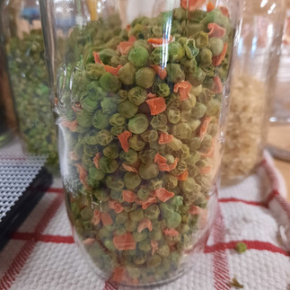 Talk about quick and easy!! Peas dry out and hold their shape very well---and they cook up in a flash. They don't have a weird tooth-feel to them, either. The carrots do have a bit more texture when cooked but I don't mind it. You just have to let them cook a bit longer. I suggest buying bags of one veg rather than a mixed bag. The carrots take a lot longer than the peas to dry, so I don't buy frozen peas & carrots that come in 1 bag.