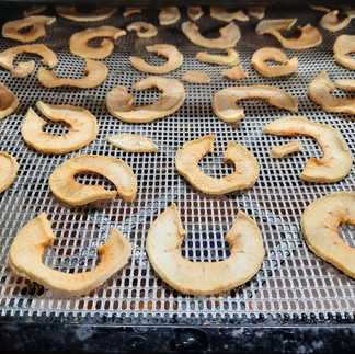 Different types of apples dry differently. Some shrink up a LOT, while others keep a bit more of their moisture content. Below are examples of a Gala, a Granny Smith, and a McIntosh. I also included some pears. Pears are AMAZING dried! They are one of my new favorites!!