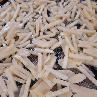 Ok, I absolutely LOVE to dry potatoes!! And I always use fresh ones. I've never dried frozen ones although I am a bit interested--I might have to try it just to see what happens. But using fresh ones works just fine for me. If you like to buy scalloped or au gratin potatoes in box form from the store then you'll be familiar with how a dried potato feels texture-wise. They are hard and very light weight! They cook up fabulously well though and taste just like a regular potato! I have a fabulous chopping machine that makes perfect diced and julienned sliced pieces. I peel the potatoes first---I am not a fan of dried potato skin. They taste like dirt! Once they are peeled, I let them soak a while in a bowl of clean water with some fruit fresh or lemon juice/vinegar. This helps them from totally oxidizing and turning an ugly brown once they are dried. It doesn't keep them pearly white but it's close enough for me. I find that high-starch content potato like a Russet or an Idaho brown the most. A medium-starch potato like a White potato is my particular favorite one to dry. They stay a nice color and I really like their cooked texture. But, use what YOU like. That's the key. Once they come out of the dehydrator, they are ready to be added to soups, stews, and casseroles galore! I love making potato soup out of them. I let them cook a while then go at them with my immersion blender. They get almost silky in texture!! I adore it!